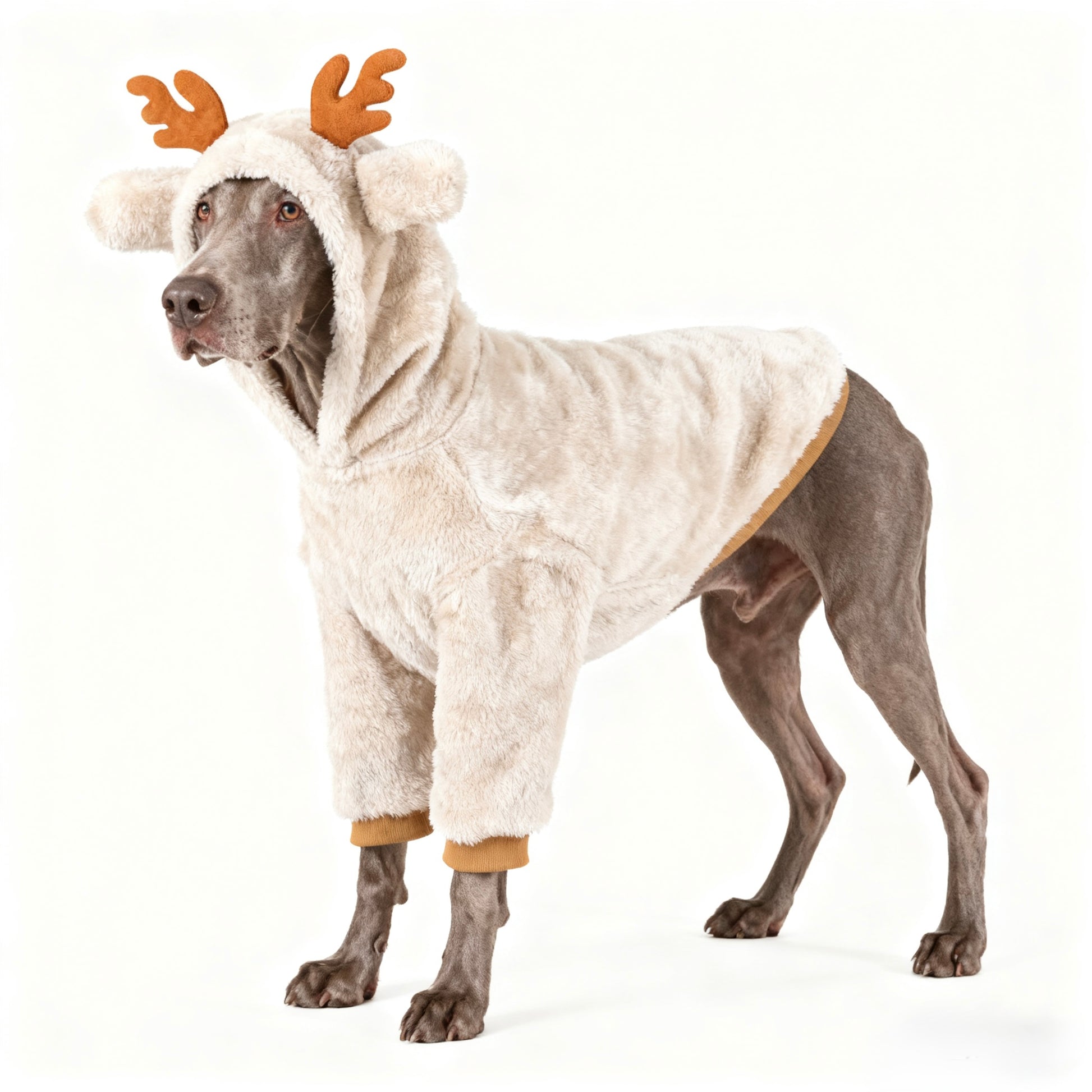 • Cream faux fur with hooded antler design for festive charm